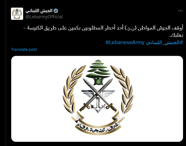 من جهته، أعلن الجيش اللبناني عن توقيف المدعو "ن.ز." ، واصفاً إياه بأنه أحد أخطر المطلوبين، موضحاً أنه أوقف في كمين تم تنفيذه على طريق الكنيسة بعلبك في منطقة البقاع شرقي لبنان.