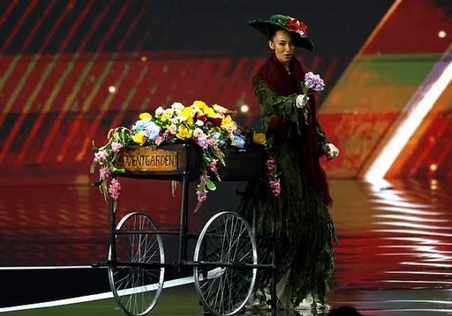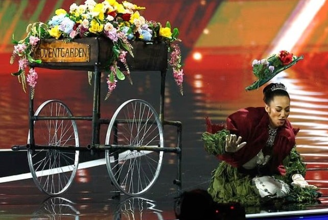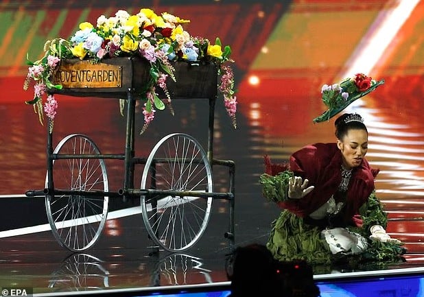 وتعثرت ملكة جمال بريطانيا وهي تمد باقة الزهور الخاصة بها قبل أن تنفض نفسها بسرعة وتنهض على قدميها وتخلع معطفها لتكشف عن فستان سهرة مبهر وأثار سقوط دوليتل المفاجئ مخاوف العديد من المشاهدين من أن تكون المتسابقة قد أصيبت بأذى لكن لاتيمر كشف لاحقًا إلى أن سقوطها كان مدبرًا عمدًا، ليرمز إلى صعود دوليتل من الفقر إلى الثراء.