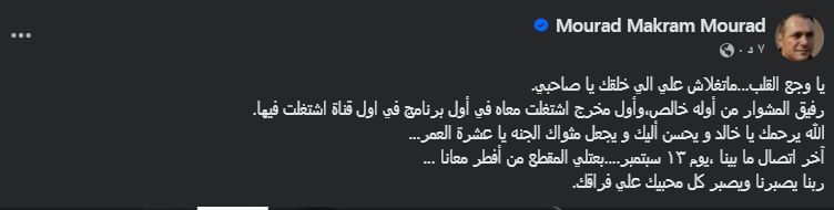 نعى الفنان مراد مكرم وفاة خالد شبانة، رئيس قطاع القنوات المتخصصة بالتليفزيون، والذي وافته المنية أمس الأربعاء، برسالة مؤثرة عبر حسابه على موقع التواصل الاجتماعي «فيسبوك»، وقال مكرم في رثائه: «يا وجع القلب، ماتغلاش علي الي خلقك يا صاحبي.. رفيق المشوار من أوله خالص،وأول مخرج اشتغلت معاه في أول برنامج في اول قناة اشتغلت فيها».