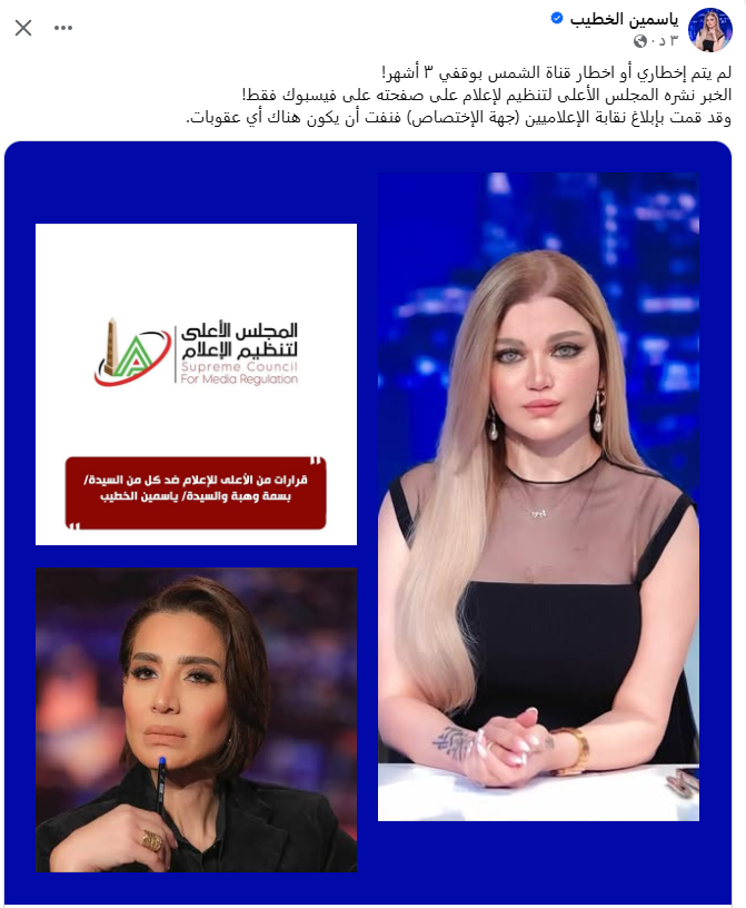 وكتبت ياسمين الخطيب عبر حسابها بموقع فيسبوك: “لم يتم إخطاري أو اخطار قناة الشمس بوقفي ٣ أشهر! الخبر نشره المجلس الأعلى لتنظيم لإعلام على صفحته على فيسبوك فقط! وقد قمت بإبلاغ نقابة الإعلاميين (جهة الإختصاص) فنفت أن يكون هناك أي عقوبات”.