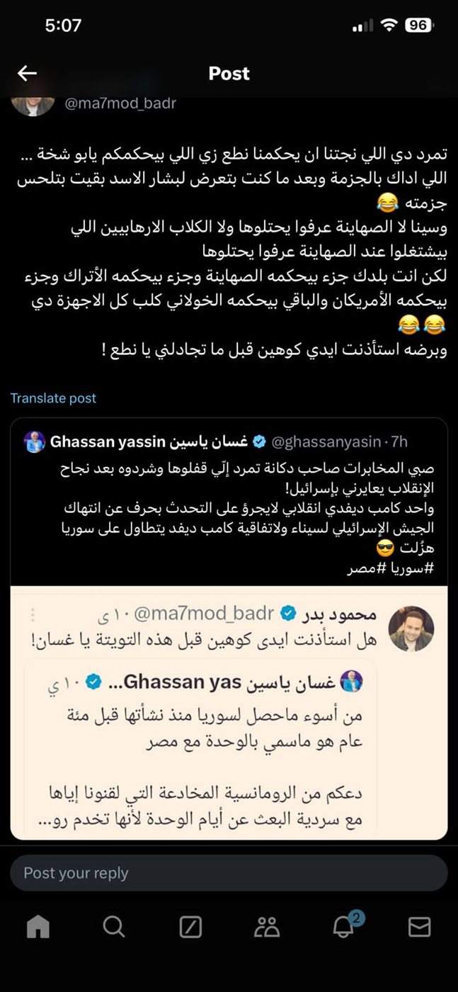 وعاد الصحفي السوري بمشاركة منشور بدر والرد عليه قائلاً: «صبي المخابرات صاحب دكانة تمرد اللي قفلوها وشردوه بعد نجاح الانقلاب يعايرني بإسرائيل! واحد كامب ديفدي انقلابي لا يجرؤ على التحدث بحرف عن انتهاك الجيش الإسرائيلي لسيناء ولاتفاقية كامب ديفد يتطاول على سوريا هزُلت».