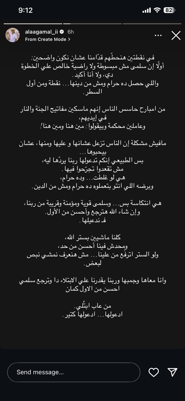 وتابع علاء جمال قائلًا : " مافيش مشكلة إن الناس تزعل عشانها وعليها ومنها، عشان بيحبوها،بس الطبيعي إنكم تدعولها ربنا يردّها ليه، مش تقعدوا تجرّحوا فيها،هي لو غلطت... وده حرام، وبرضه اللي انتو بتعملوه ده حرام ومش من الدين،هي انتكاسة بس... وسلمى قوية ومؤمنة وقريبة من ربنا، وإن شاء اللّٰه هترجع وأحسن من الأول ف ندعيلها ،كلنا ماشيين بستر الله، ومحدش فينا أحسن من حد، ولو الستر اترفع من علينا مش هنعرف نمشي نبص لبعض،وانا معاها وجمبها وربنا يقدرنا علي الابتلاء دا وترجع سلمي احسن من الاول كمان،من عاب ابتُلي ،ادعولها ادعولها كتير.