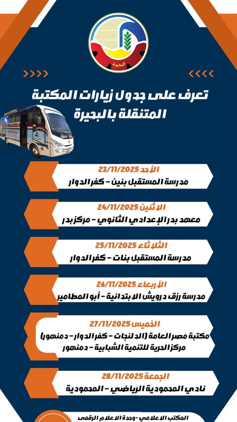 وتتضمن جولة المكتبة المتنقلة خلال الفترة من الأحد 23 نوفمبر وحتى الجمعة 28 نوفمبر 2025، خط السير التالي: