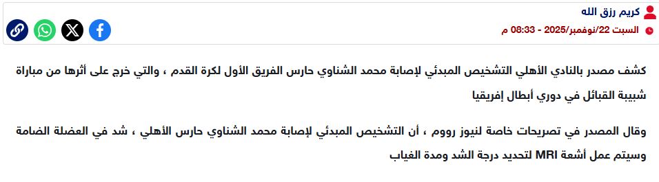 وكان نيوز رووم قد نشر عقب المباراة تفاصيل إصابة اللاعب وأن الأشعة ستحدد موقفه ومدة غيابه مثلما أكد الدكتور أحمد جاب الله طبيب الفريق