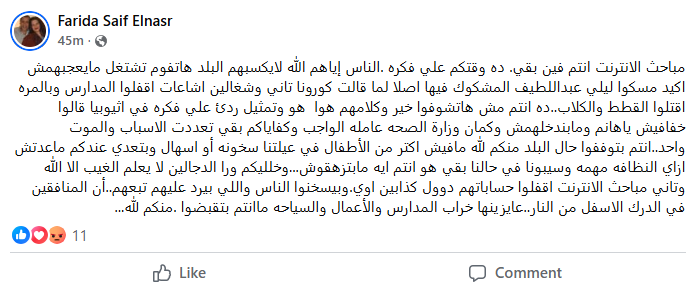 حيث قالت فريدة سيف النصر في منشورها: “مباحث الانترنت انتم فين بقى، ده وقتكم علي فكرة، الناس إياهم الله لا يكسبهم البلد هاتقوم تشتغل مايعجبهمش اكيد، مسكوا ليلي عبداللطيف المشكوك فيها اصلا لما قالت كورونا تاني، وشغالين اشاعات اقفلوا المدارس، وبالمرة اقتلوا القطط والكلاب، ده انتم مش هاتشوفوا خير وكلامهم هو هو وتمثيل ردئ علي فكرة، في اثيوبيا قالوا خفافيش يا هانم ومابندخلهمش، وكمان وزارة الصحة عاملة الواجب، وكفاياكم بقي تعددت الاسباب والموت واحد، انتم بتوقفوا حال البلد منكم لله، مافيش أكتر من الأطفال في عيلتنا سخونة أو اسهال وبتعدي، عندكم ماعدتش ازاي، النظافة مهمة وسيبونا في حالنا بقي هو انتم ايه مابتزهقوش، وخليكم ورا الدجالين، لا يعلم الغيب الا الله، وتاني مباحث الانترنت اقفلوا حساباتهم دوول كذابين اوي، وبيسخنوا الناس واللي بيرد عليهم تبعهم، أن المنافقين في الدرك الاسفل من النار، عايزينها خراب المدارس والأعمال والسياحة ما انتم بتقبضوا، منكم لله”.
