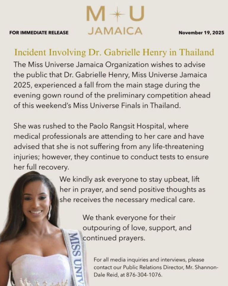 تعرضت ملكة جمال جامايكا، غابرييل هنري لحادث مروع خلال مشاركتها في مسابقة ملكة جمال الكون قبل 3 أيام، أثناء تقدمها بفستان براق وحذاء ذي كعب عالٍ، ما أدى إلى نقلها على وجه السرعة إلى مستشفى “باولو رانجسيت” لإجراء الفحوصات اللازمة.