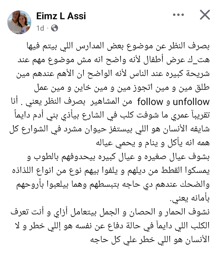 وأضافت في منشورها: «أنا تقريبآ عمري ما شوفت كلب في الشارع بيأذي بني أدم دايماً شايفه الأنسان هو اللي بيستفز حيوان مشرد في الشوارع كل همه انه يأكل و ينام و يحمي عياله».