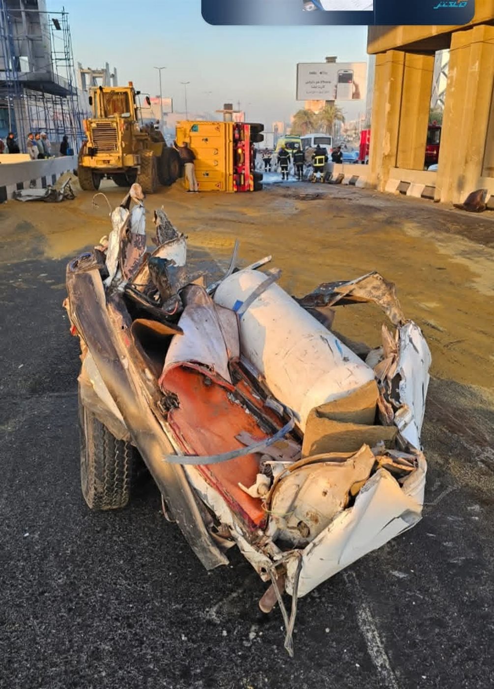 مصرع شخصين بسبب انقلاب تريلا علي سيارة بيجو بمحور القاهره الدائري