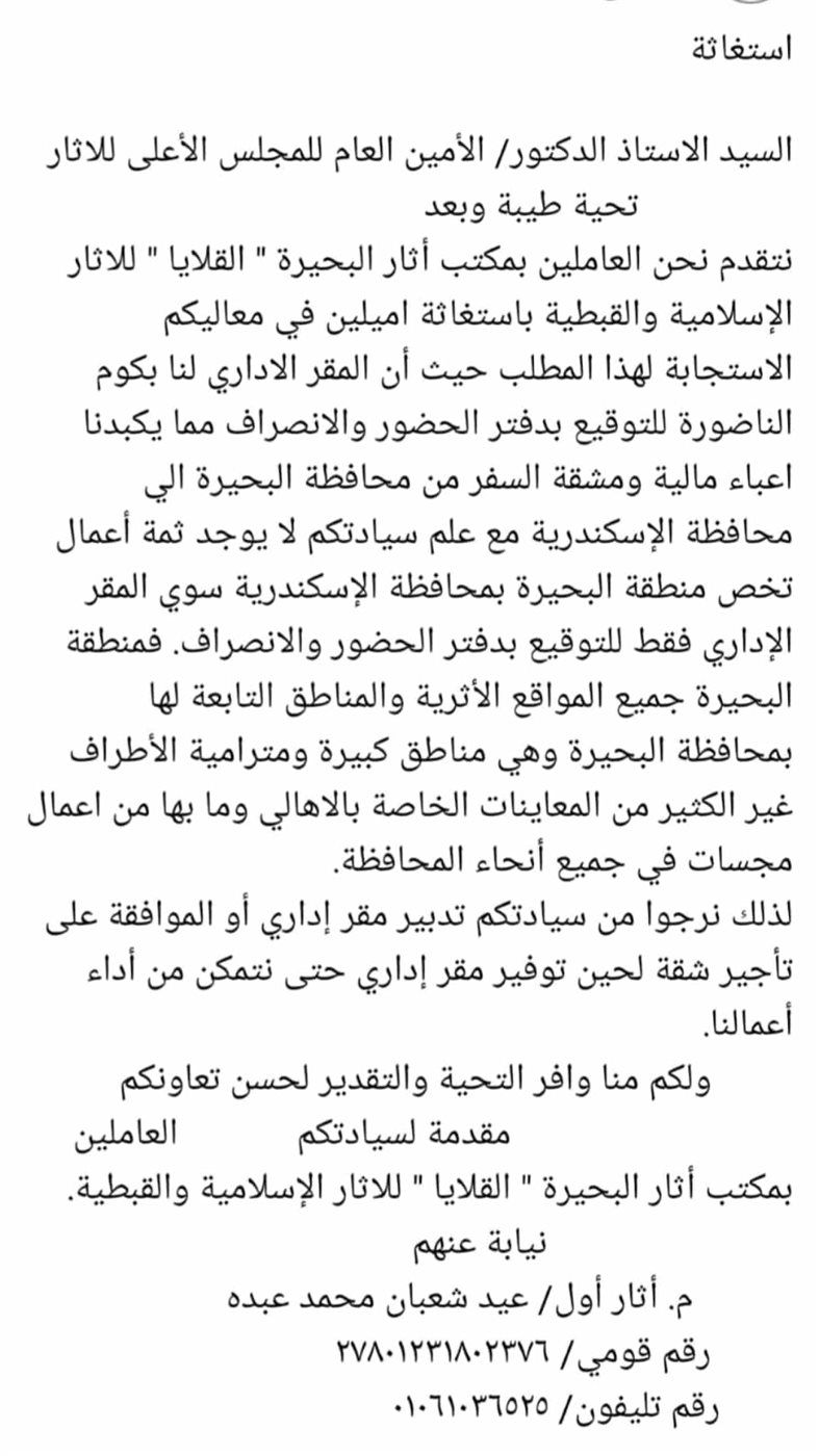 وعلى سبيل المثال فقد تصاعدت خلال الفترة الماضية أصوات مفتشين مكتب آثار البحيرة القلايا، لمعاناتهم بسبب عدم وجود مقر إداري، واضطرارهم للسفر يوميًا للتوقع حضوريًا بالإسكندرية.