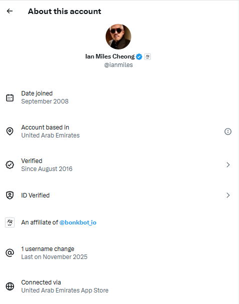 أظهر التحديث الجديد لمنصة "إكس"، تواجد المؤثر اليميني الماليزي "إيان مايلز تشيونغ" في الإمارات، في حين يعتقد أنه مقيمًا في ماليزيا، وأكدت صحيفة "The Star" أنه تم التأكد بأن حسابه ليس في الولايات المتحدة الأمريكية.