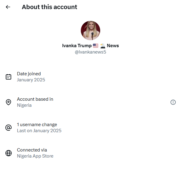 حساب مؤيد للرئيس ترامب، ويُعلق على السياسة الأمريكية وكان صوتًا قويًا لدونالد، ظهر وفقًا للتحديث الأخير أنه في نيجيريا وليس الولايات المتحدة.
