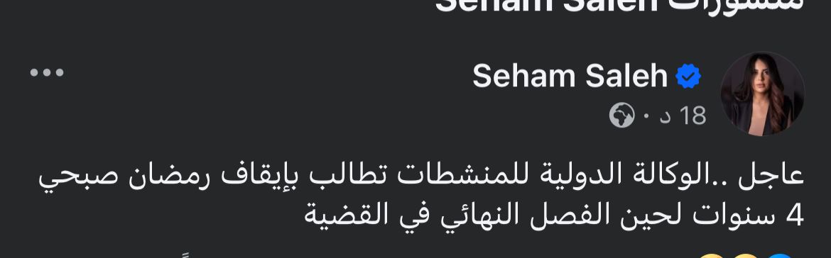 وأوضحت "صالح" في منشور لها عبر حسابها على فيسبوك، أن الوكالة الدولية للمنشطات تطالب بإيقاف رمضان صبحي 4 سنوات، لحين الفصل النهائي في القضية.