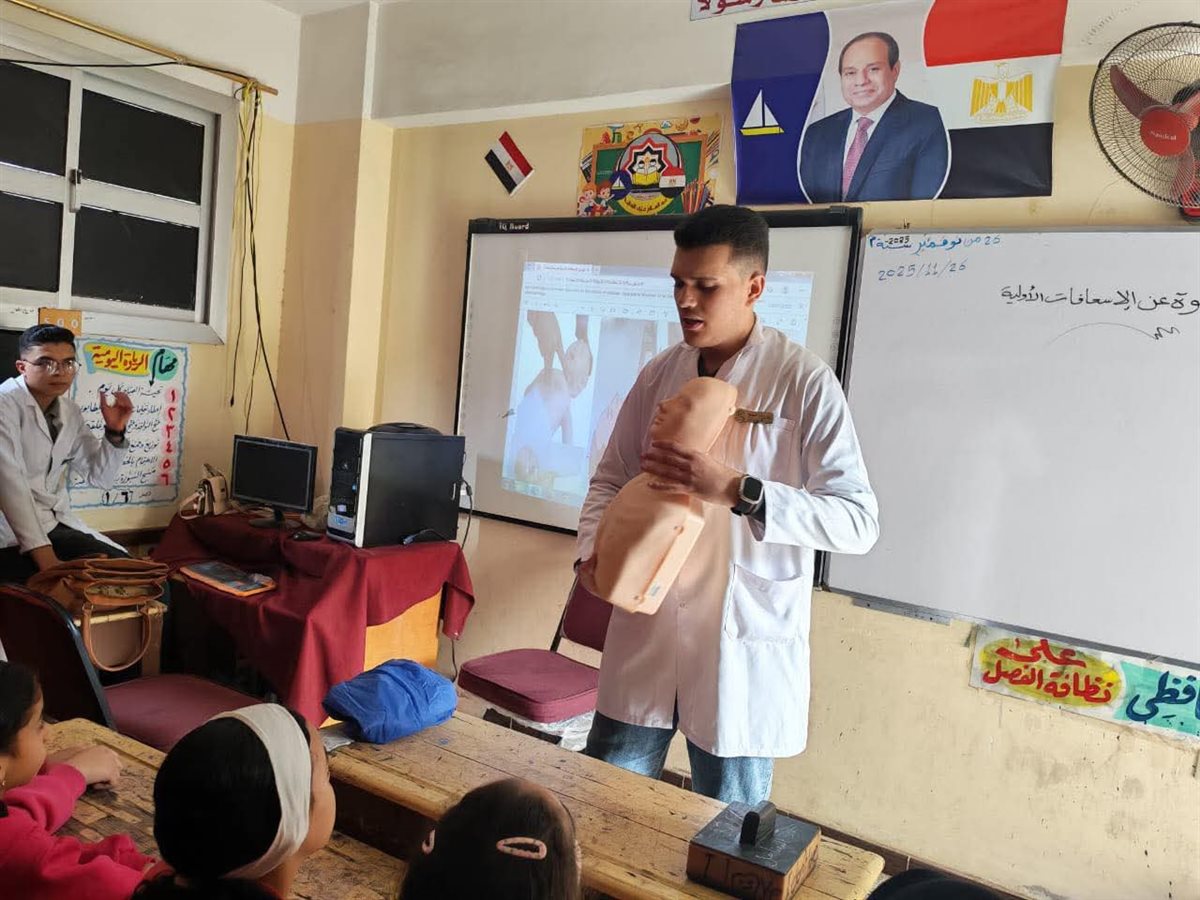 في اطار توجه الدولة لتعزيز منظومة التعليم الصحي ورفع كفاءة الطلاب في مختلف المراحل العمرية وتنفيذا لتعليمات الدكتور خالد عبد الغفار نائب رئيس مجلس الوزراء للتنمية البشرية ووزير الصحة والسكان بضرورة الارتقاء بمستوى التعليم الفني الصحي وتشجيع التعاون بين قطاعات الدولة المختلفة، شهدت محافظة دمياط اليوم نشاطا تعليميا وتوعويا مميزا يجمع بين مديرية الصحة ومديرية التربية والتعليم بهدف نشر الوعي الاسعافي بين طلاب المرحلة الابتدائية.