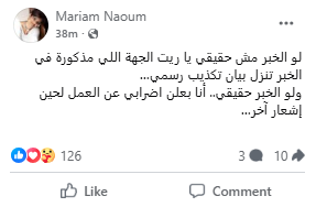 وقد أعربت المؤلفة مريم نعوم عن غضبها، حيث قالت في منشور عبر حسابها الرسمي على موقع التواصل الإجتماعي فيسبوك: “لو الخبر مش حقيقي يا ريت الجهة اللي مذكورة في الخبر تنزل بيان تكذيب رسمي، ولو الخبر حقيقي أنا بعلن اضرابي عن العمل لحين إشعار آخر”.