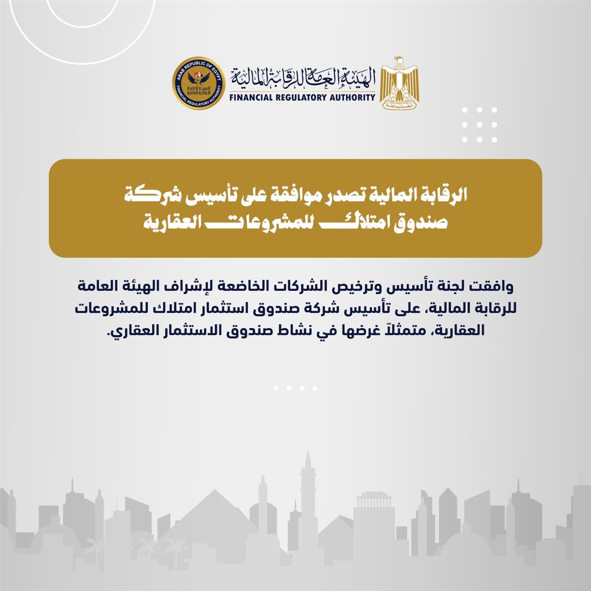 صدرت الموافقات على تأسيس شركة صندوق امتلاك للمشروعات العقارية متمثلاً غرضها في نشاط صندوق الاستثمار العقاري، وتأسيس شركة فوري القابضة للاستثمارات المالية متمثلاً غرضها في الاشتراك في تأسيس الشركات التي تصدر أوراقاً مالية أو في زيادة رؤوس أموالها.