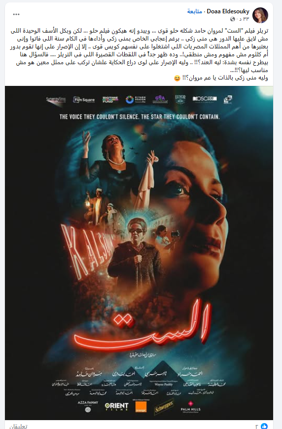 رأت دعاء الدسوقي أن الفيلم من خلال البرومو يبدو قوي ومميز إلا أن الدور لا يليق على منى زكي: "تريلر فيلم "الست" لمروان حامد شكله حلو قوي… ويبدو إنه هيكون فيلم حلو… لكن وبكل الأسف الوحيدة اللي مش لايق عليها الدور هي منى زكي.. برغم إعجابى الخاص بمنى زكي وأداءها في الكام سنة اللي فاتوا وإني بعتبرها من أهم الممثلات المصريات اللي اشتغلوا على نفسهم كويس قوي .. إلا إن الإصرار على إنها تقوم بدور أم كلثوم مش مفهوم ومش منطقي!.. وده ظهر جدًا في اللقطات القصيرة اللي في التريلر …. فالسؤال هنا بيطرح نفسه بشدة: ليه العند؟!! .. وليه الإصرار على لوي دراع الحكاية علشان تركب على ممثل معين هو مش مناسب ليها؟!!… وليه منى زكى بالذات يا عم مروان؟!