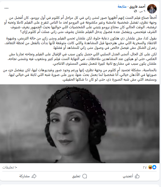 رأى طارق عزت أن تقديم عمل عن السيرة الذاتية لـ أم كلثوم يُعد مجازفة حقيقية: “بمناسبة فيلم الست.... لو ينفع أقول رأيي .. مروان حامد مخرج كبير أوي وأنا يعتبر من جمهوره اللي تقريبا ما فوتلوش فيلم من أول لي لي .. لحد كيرا والجن .. يعني متأكد أنه هايعمل فيلم قوي جدا على مستوي الصورة والتقنيات الفنية بس المشكلة اللي أنا مشفق عليه منها أن صابرين عملت مسلسل أم كلثوم ونجح جدا لدرجة أن فردوس عبد الحميد لما عملت فيلم أم كلثوم بعده سقط سقوط شنيع ... فيلم السير الذاتية في مصر مش ناجح الوحيد اللي نجح فيه بامتياز كان احمد ذكي لقدرته علي تقديم الشخصية بمصداقية شديدة مع وضع لمسته الفنيه .. طبعا رفعت الجمال ماحدش شافه عشان نقدر نقرر ان محمود عبد العزيز نجح في تجسيد شخصيته لانهي درجة وكذلك أحمد الهوان لعادل الامام .. رأيي الشخصي أن أفلام السير الذاتية هتكون ناجحة جدا لو اتعملت وثائقية واحنا شطار في صناعتها.. بس برضه أنا ضد الحكم على الفيلم من قبل ما نشوفه عشان نقدنا ليه يبقي موضوعي ... (مع العلم إني مش من عشاق مني زكي)”.