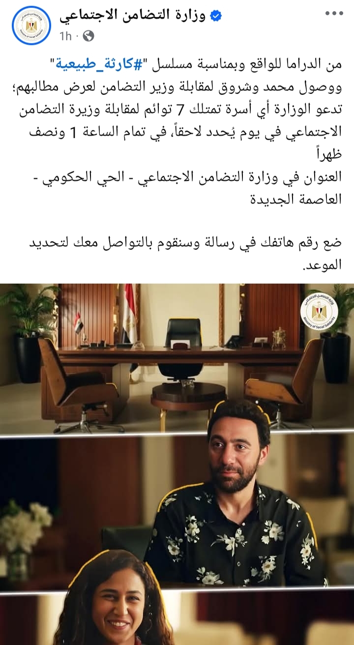 من الدراما للواقع وبمناسبة مسلسل «كارثة طبيعية» ووصول محمد وشروق لمقابلة وزير التضامن لعرض مطالبهم؛ دعت الوزارة التضامن الاجتماعي برئاسة الدكتورة مايا مرسى، الأسر التي تمتلك 7 توائم لمقابلة الوزيرة في يوم يُحدد لاحقاً، في تمام الساعة 1 ونصف ظهراً.