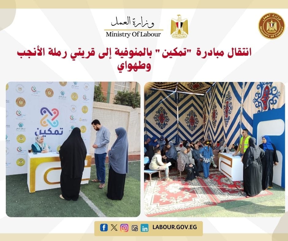 انتقلت مبادرة "تمكين" التي تنفذها مديرية العمل بالمنوفية، تحت رعاية وزير العمل محمد جبران، إلى قريتي رملة الأنجب وطهواي بمركز أشمون، وذلك بعد اختتام فعالياتها في قرية شما. وأوضح عماد سعيد مدير المديرية أن المبادرة تأتي طبقًا للبروتوكول الموقع بين وزارتي العمل والتضامن الاجتماعي ومؤسسة صناع الخير. وتقدم المبادرة دورات تدريبية في مهن الكهرباء، والسباكة، والتطريز، والكروشيه، والأحجار الكريمة. يحصل المتدرب في نهاية الدورة على ترخيص مزاولة الحرفة، وشهادة قياس مستوى المهارة، وحقيبة عِدة، كما تتضمن الخدمات قوافل طبية علاجية مجانية واستخراج بطاقات فيزا بنك مصر مجانًا لأهالي القرى المستهدفة.