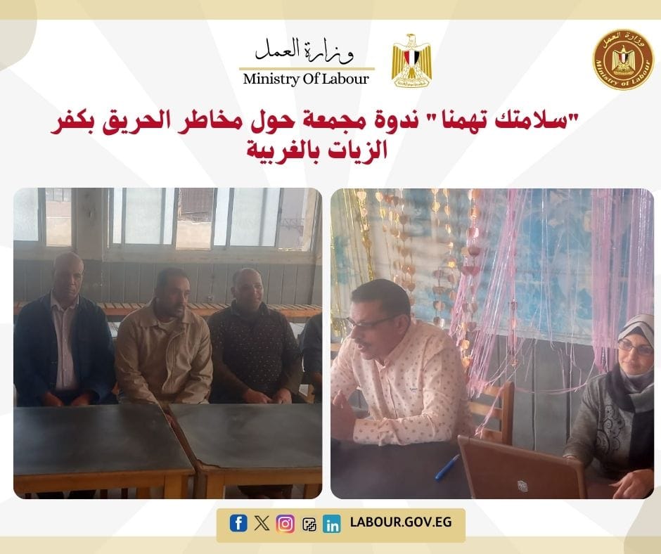في إطار الدور الهام لوزارة العمل في الحفاظ على القوى العاملة، وتحت رعاية وكيل وزارة العمل بالغربية نهاد عبدالله ، عقد مكتب السلامة والصحة المهنية بكفر الزيات ندوة توعوية بعنوان "سلامتك تهمنا". الندوة كانت مجمعة بين شركة الإسكندرية للزيوت والصابون وشركة أبو الهول بمقر شركة الإسكندرية للزيوت والصابون. ودارت الندوة، التي حاضرت فيها المهندسة إيمان الحصري، حول مفهوم السلامة والصحة المهنية وأنواع المخاطر، مع التركيز بشكل خاص على مخاطر الحريق.