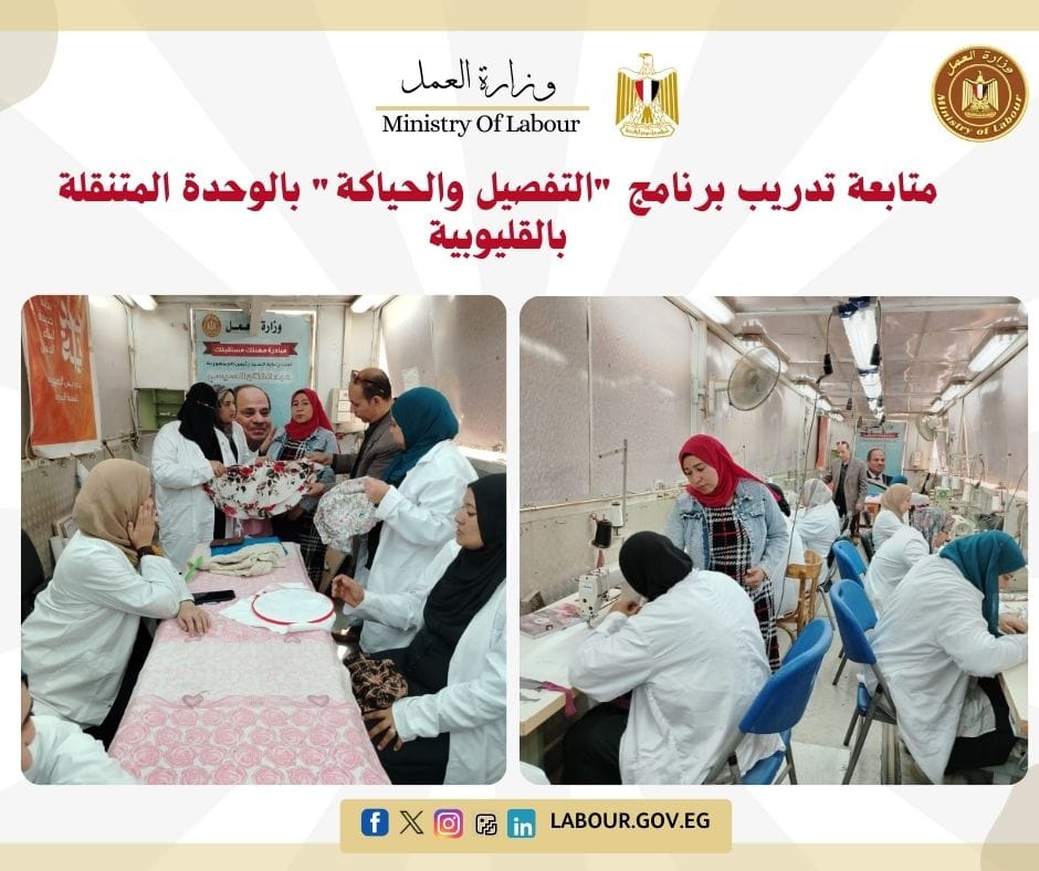 تنفيذًا لتوجيهات وزير العمل محمد جبران ومحافظ القليوبية أيمن عطية، قامت مديرية العمل بالقليوبية بمتابعة سير برنامج تدريب "التفصيل والحياكة" بوحدة التدريب المتنقلة بقرية منية شبين القناطر. وأوضح مدير المديرية افوزي صابر أن الدورة تستهدف (14) متدربة وتستمر حتى 4 ديسمبر 2025 بواقع 150 ساعة تدريبية، وذلك ضمن المبادرة الرئاسية "حياة كريمة" و*"مهنتك مستقبلك"*، لتأهيل الشباب على المهن التي يحتاجها سوق العمل والحصول على فرص عمل لائقة.