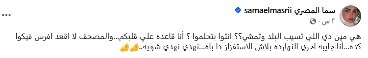 وقالت سما المصري في منشور له عبر حسابها على فيسبوك: هي مين دي اللي تسيب البلد وتمشي؟ انتوا بتحلموا، أنا قاعدة على قلبكم، والمصحف لا أقعد أفرس فيكم كده. أنا جايبة آخري النهارده، فبلاش الاستفزاز ده بقى.. نهدا شوية.