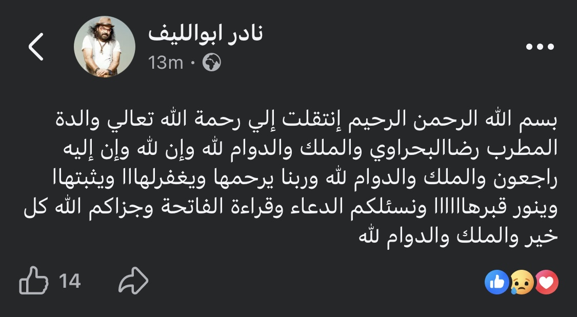 وقال نادر أبو الليف في منشوره: “بسم الله الرحمن الرحيم انتقلت إلي رحمة الله تعالي والدة المطرب رضا البحراوي، والملك والدوام لله وإن لله وإن إليه راجعون والملك والدوام لله وربنا يرحمها ويغفرلها ويثبتها وينور قبرها، ونسئلكم الدعاء وقراءة الفاتحة وجزاكم الله كل خير والملك والدوام لله”.