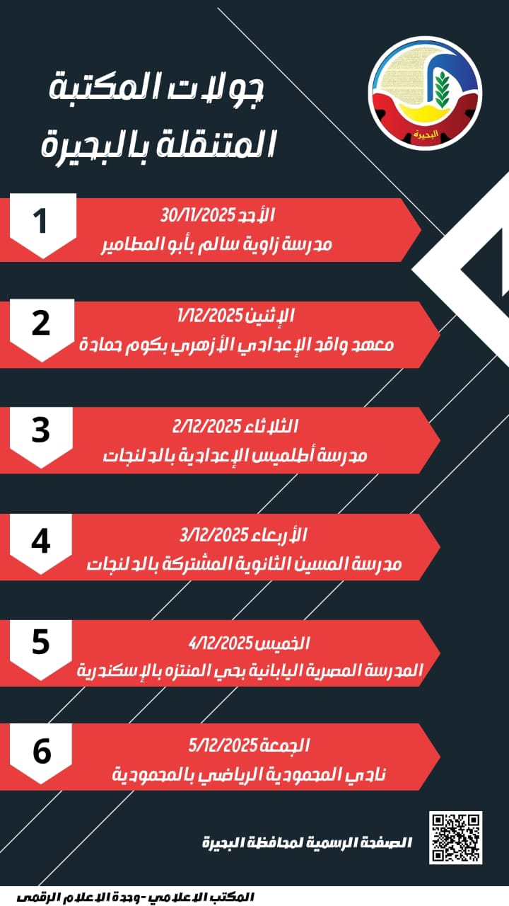 تبدأ مكتبة مصر العامة بدمنهور غدًا الأحد 30 نوفمبر 2025 تنفيذ برنامج جولاتها الميدانية للمكتبة المتنقلة، بهدف نشر ثقافة القراءة وتوسيع نطاق الاستفادة من خدماتها بين الطلاب والشباب بعدد من مراكز المحافظة؛ تنفيذًا لتوجيهات الدكتورة جاكلين عازر – محافظ البحيرة، بتعزيز الدور الثقافي والتوعوي داخل المجتمع.