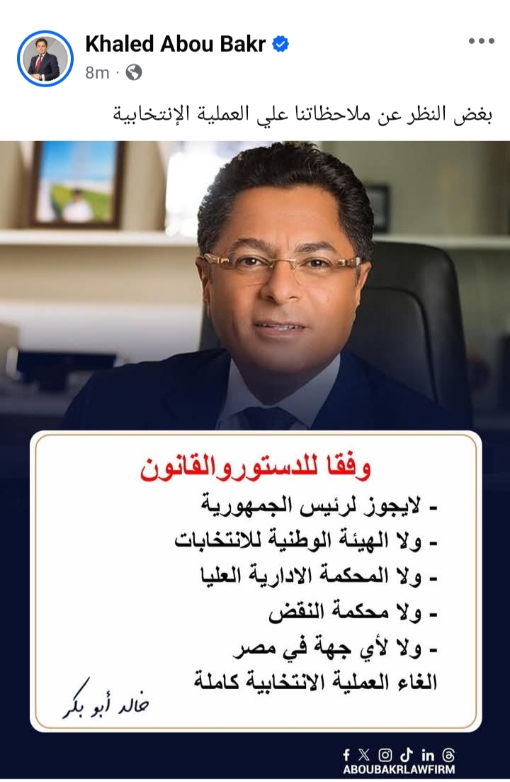 وأكد أبو بكر في منشور عبر مواقع التواصل الاجتماعي، أنه وفقا للدستور والقانون، لا يجوز لرئيس الجمهورية أو المحكمة الإدارية العليا أو الهيئة الوطنية للانتخابات أو محكمة النقض أو أي جهة في مصر إلغاء العملية الانتخابية كاملة.
