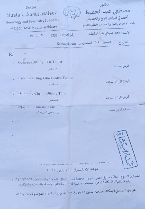 وبعد شهر عادت له الهلاوس مرة أخرى وحالته تدهورت مؤخرًا كثيرا، وأصبح يهاجم أفراد عائلته دون سبب وعادتا ما يتمم بعبارات غريبة وكأنه يتحدث مع أشخاص آخرون ويأمرهم بالجلوس صفا واحدا، ويرفض تناول العلاج تمامًا وتحدث له حالات هياج شديد وتكسير لمحتويات المنزل والسب والشتم إلى أفراد عائلته والتعدي الدائم على والدته المسنه المريضة وشقيقته الصغرى حتى صارت حياتهم جحيم بسبب ما يفعله معهم، ومع غياب استجابة واضحة من الجهات المختصة لنقله إلى مستشفى علاجي، أصبحت الأسرة تعيش في “كابوس يومي” خوفًا من أن ينفذ تهديداته في أي لحظة.