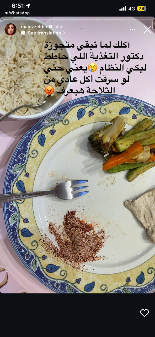نشرت الفنانة مي عزالدين صورة جديدة تستعرض فيها جزءًا من حميتها الغذائية التي تتبعها بعد الزواج، معلقة بأسلوب طريف على التزامها الصارم: «أكلك لما تبقي متجوزة دكتور التغذية اللي حاطط ليكي النظام يعني حتي لو سرقت أكل عادي من الثلاجة هيعرف».