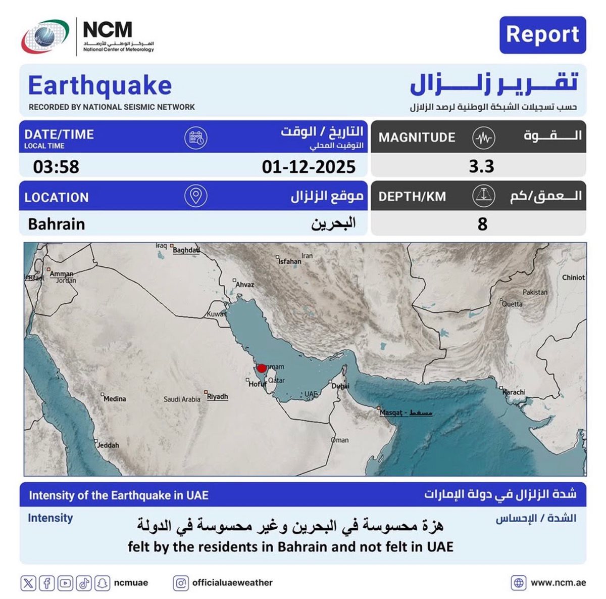 المركز الوطني للأرصاد الإماراتي: هزة أرضية بقوة 3.3 ريختر في البحرين