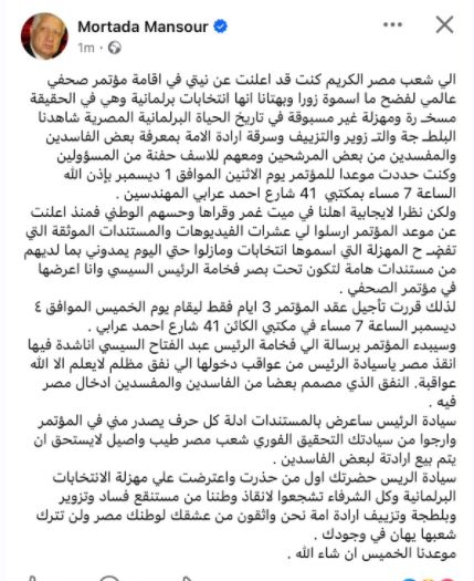وأضاف منصور أنه كان قد حدّد موعد المؤتمر اليوم الاثنين 1 ديسمبر في تمام السابعة مساء بمكتبه في 41 شارع أحمد عرابي بالمهندسين، إلا أن التفاعل الإيجابي من أهالي ميت غمر وقراها دفعه إلى إعادة النظر في الموعد.