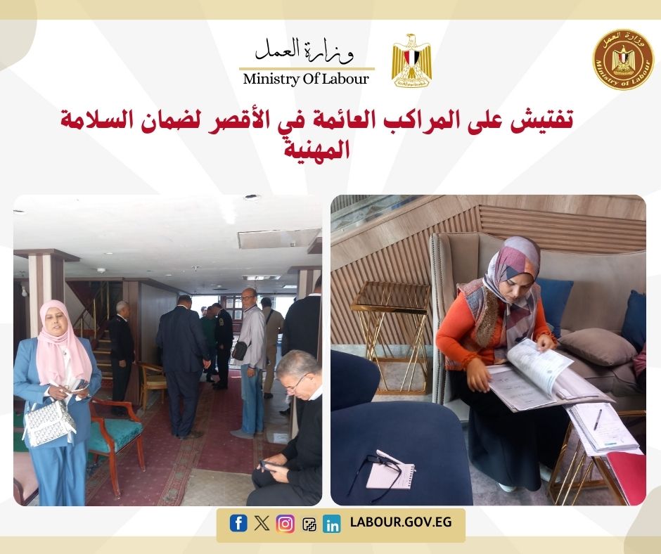 شاركت مديرية عمل الأقصر، ممثلة في مكتب السلامة والصحة المهنية، في لجنة تفتيشية مشتركة مع شرطة المسطحات المائية وممثلي وزارتي السياحة والبيئة، على عدد (10) من المراكب العائمة. أوضح السيد/ محمود باسل، مدير المديرية، أن الهدف هو الحفاظ على السلامة والصحة المهنية للعاملين والسياح والوقاية من المخاطر المحتملة، وذلك بناءً على تعليمات وزير العمل محمد جبران لزيادة الإنتاجية ودعم الاستثمار.