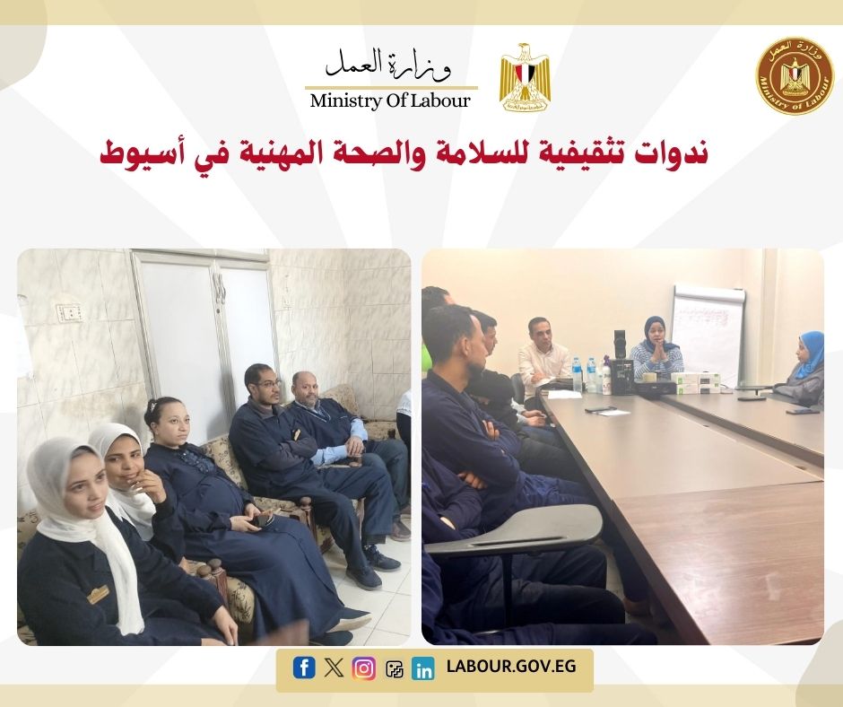 نظمت مديرية عمل أسيوط مجموعة من الندوات التثقيفية حول السلامة والصحة المهنية في عدة منشآت، منها الشركة الدولية للمستلزمات الطبية (مصنع السرنجات) ومستشفى البداري المركزي. وأوضح د. حازم علي مدير المديرية أن الندوات تناولت مستجدات قانون العمل الجديد، ودور القانون في حماية العاملين من المخاطر. تأتي هذه الندوات تنفيذاً لتوجيهات وزير العمل محمد جبران بنشر ثقافة السلامة والصحة المهنية.
