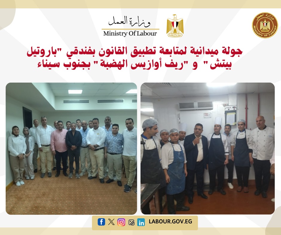 قاد أكرم محمد سيد أحمد، مدير مديرية العمل بجنوب سيناء، جولة ميدانية بمدينة شرم الشيخ شملت فندق باروتيل بيتش، وفندق ريف أوازيس الهضبة. وأوضح أن الجولة تهدف إلى متابعة تطبيق أحكام قانون العمل الجديد رقم 14 لسنة 2025، والتأكد من التزام المنشأة بتطبيق الحد الأدنى للأجور ومراقبة ساعات العمل. تأتي هذه المتابعة تنفيذاً لتعليمات وزير العمل محمد جبران.