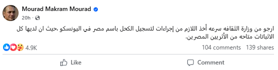 وقال مراد مكرم في منشوره له عبر حسابه الرسمي على موقع التواصل الاجتماعي «فيسبوك»: “ارجو من وزارة الثقافة سرعة أخذ اللازم من إجراءات لتسجيل الكحل باسم مصر في اليونسكو، حيث أن لديها كل الإثباتات متاحة من الأثريين المصرين.”