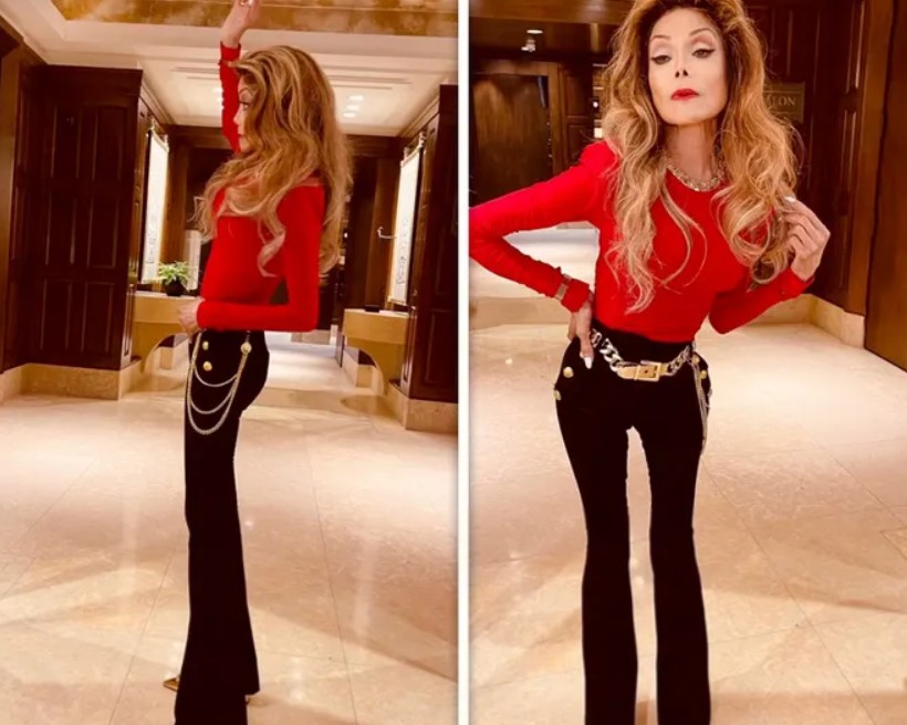 نشرت المغنية سلسلة من الصور على إنستجرام، ظهرت فيها مرتدية بنطالا أسود ضيقا وقميصا أحمر ضيقا مع حذاء ستيليتو ذهبي.