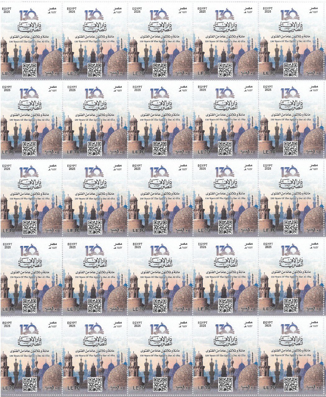 أصدرت الهيئة القومية للبريد طابع بريد تذكاريًّا؛ احتفاءً بمرور 130 عامًا على تأسيس دار الإفتاء المصرية، وتوثيقًا لهذا الحدث المهم، وإبرازًا للدور التاريخي والعلمي الذي قامت به دار الإفتاء منذ إنشائها عام 1895 في خدمة علوم الشريعة وترسيخ منهج الوسطية.