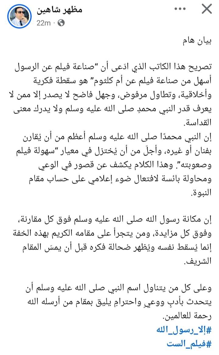 وقال مظهر في منشور عبر حسابه على موقع التواصل الاجتماعي «فيسبوك»: هذا الكاتب الذي ادّعى أن “صناعة فيلم عن الرسول أسهل من صناعة فيلم عن أم كلثوم” هو سقطة فكرية وأخلاقية، وتطاول مرفوض، وجهل فاضح لا يصدر إلا ممن لا يعرف قدر النبي محمدٍ صلى الله عليه وسلم ولا يدرك معنى القداسة.