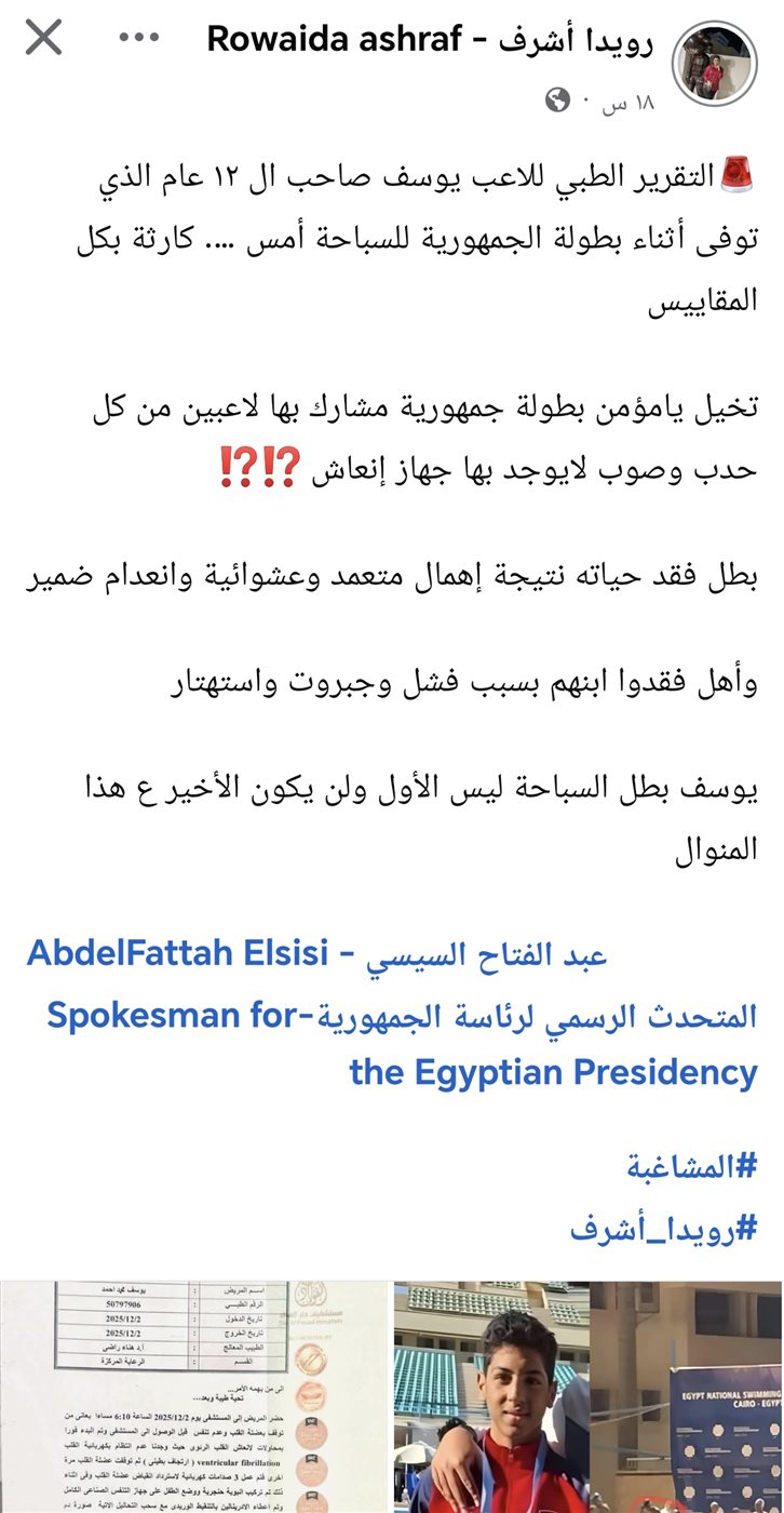 من جانبها، قالت صانعة المحتوى رويدا أشرف تعليقًا على وفاة السباح الصغير يوسف محمد 12 عامًا خلال بطولة الجمهورية للسباحة: التقرير الطبي ليوسف محمد كارثة.