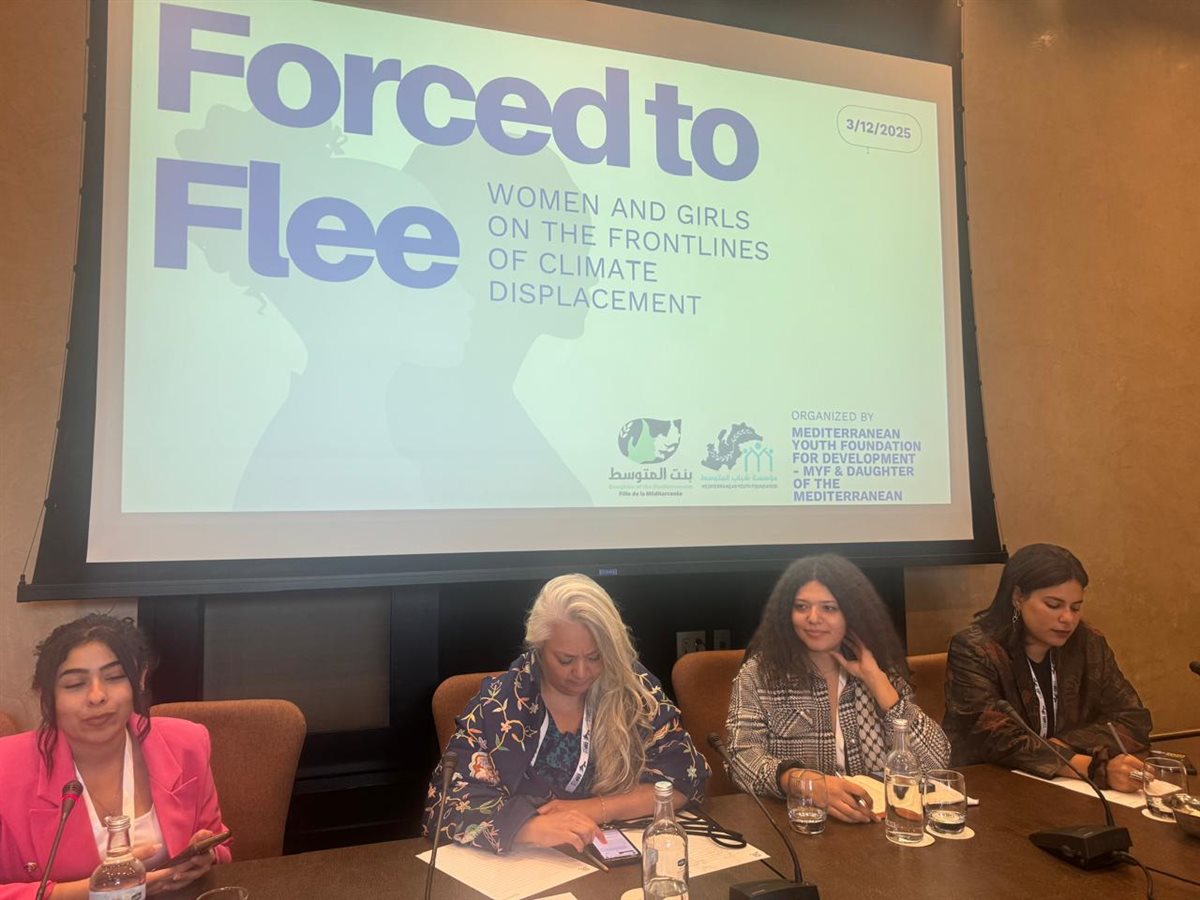 في حين، نظمت مؤسسة شباب البحر الأبيض المتوسط جلسة نقاشية اخري بعنوان "النساء والفتيات الصغيرات وخطر مواجهة النزوح المناخي"، حيث تناولت الجلسة تأثيرات النزوح المناخي على النساء والفتيات بسبب عدم المساواة، مما يجعلهن أكثر عرضة للخطر في الكوارث ويتسببن في تفاقم مشاكلهن الصحية والاقتصادية والاجتماعية، والتأثيرات السلبية للنزوح المناخي على النساء مثل زيادة مخاطر العنف، والتأثيرات الصحية ، والمخاطر الاقتصادية، والحرمان من التعليم، وتم التشديد على اهمية دمج النوع المناخي في السياسات المناخية، وتمكين النساء اقتصاديًا واجتماعيا، وتعزيز الحماية القانونية والاجتماعية للنساء، وزيادة الوعي بمخاطر تغير المناخ وسبل الحماية والتعامل مع آثاره.