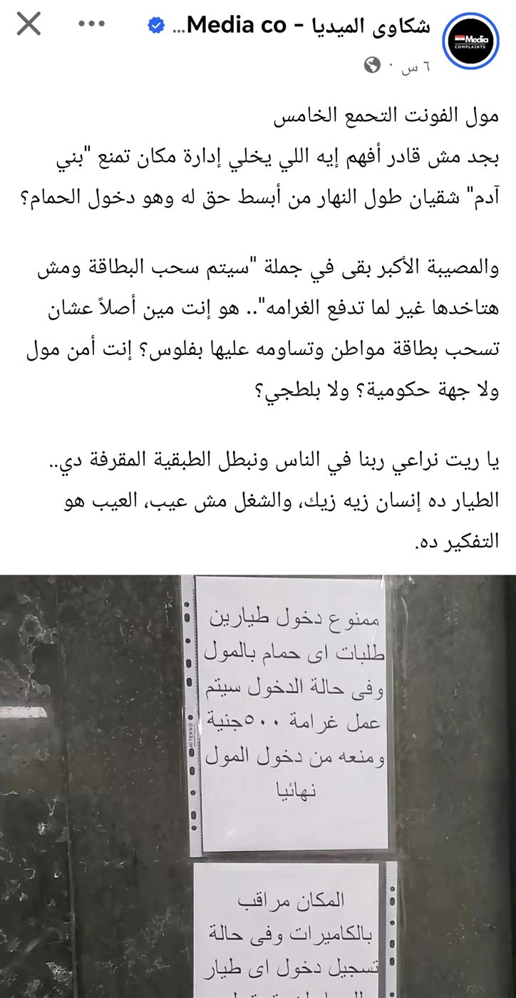 وقال أحد رواد مواقع التواصل الاجتماعي عبر صفحة شكاوي الميديا على فيسبوك: مول الفونت التحمع الخامس، بجد مش قادر أفهم إيه اللي يخلي إدارة مكان تمنع "بني آدم" شقيان طول النهار من أبسط حق له وهو دخول الحمام؟