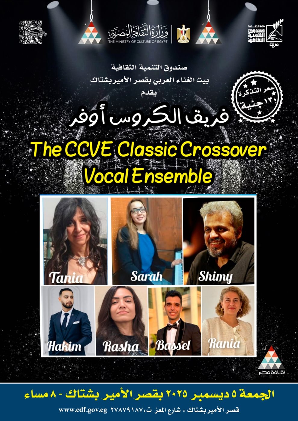 يستضيف بيت الغناء العربي بقصر الأمير بشتاك بشارع المعز أمسية غنائية لفرقة The CCVE – Classic Crossover Vocal Ensemble وذلك في تمام الثامنة مساء غداً (الجمعة 5 ديسمبر)، ويأتي ذلك في إطار استراتيجية صندوق التنمية الثقافية الهادفة إلى إتاحة تجارب فنية متنوعة، ودعم الفرق الشابة والمواهب الواعدة في مختلف مجالات الفنون.