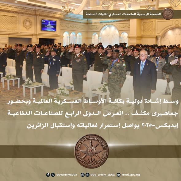 استمراراً لفعاليات المعرض الدولى الرابع للصناعات الدفاعية " إيديكس - 2025 " شهد المعرض حضور جماهيرى كثيف على مدار فعالياته بما يعكس مدى نجاح تنظيم هذا الحدث الدولى على أرض مصر ، فضلاً على المشاركة الفعالة لمختلف كبرى شركات التسليح العالمية ومشاركة مصر بجناح متميز يحتوى على صناعات عسكرية متطورة تعبر عن مسار مصر الصحيح نحو توطين مجال التسليح والصناعات الدفاعية بما يسهم فى صقل دور مصر الرائد بأفريقيا ومنطقة الشرق الأوسط.