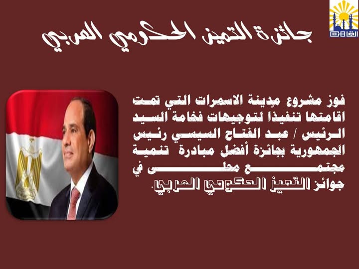 كما فازت مشروع مدينة الاسمرات التي تمت اقامتها تنفيذا لتوجيهات الرئيس السيسي كجازة افضل مبادرة تنمية مجتمع محلي في جوائز التميز الحكومي العربي.