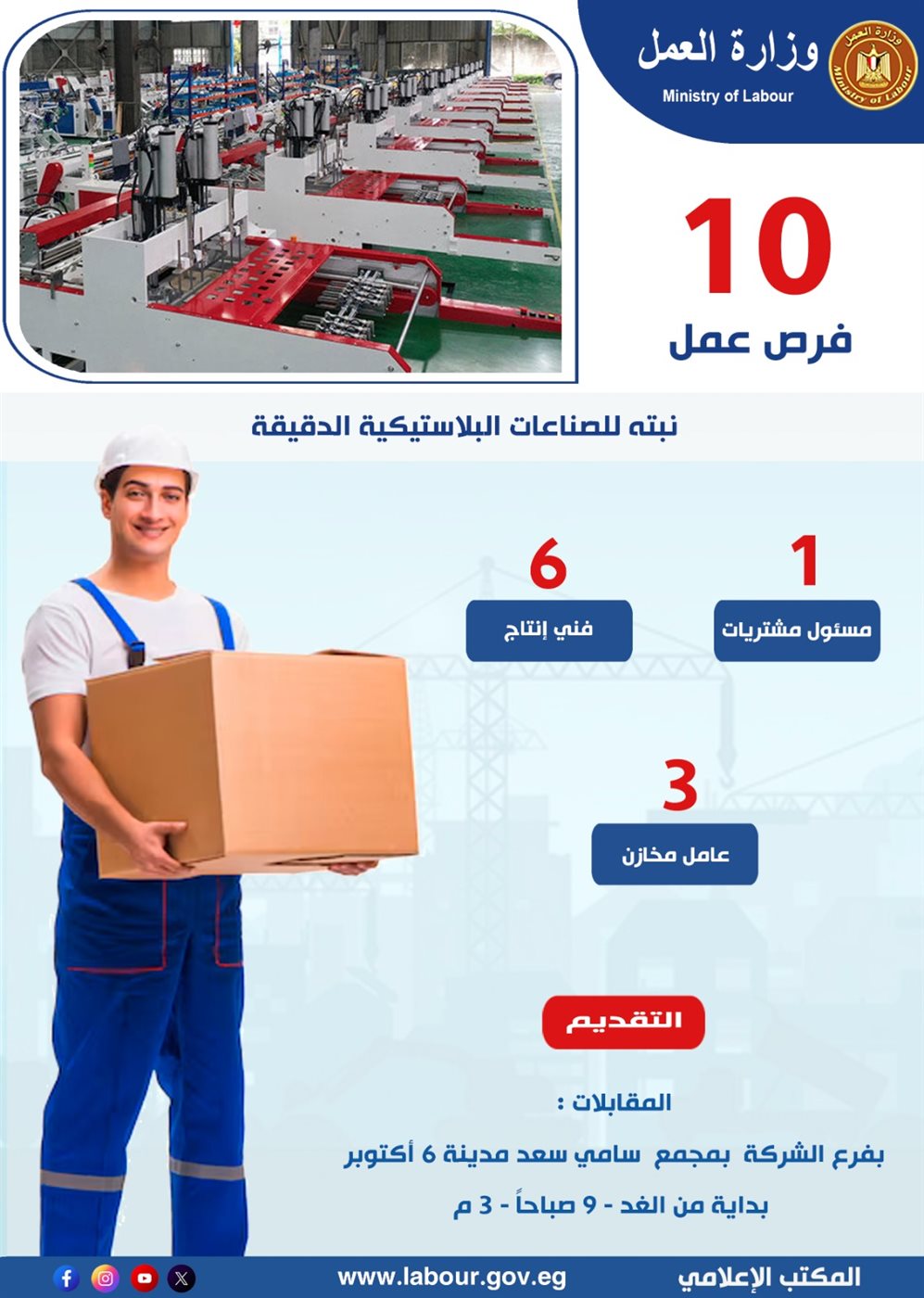 وأكدت الوزارة أن توفير هذه الوظائف يأتي ضمن خطة متكاملة لربط الباحثين عن عمل بفرص تشغيل مباشرة داخل الشركات الصناعية، بما يسهم في توفير بيئات عمل مستقرة وتحسين مستوى الدخل... الوظائف المطلوبة:1 مسؤول مشتريات ،6 فني إنتاج، 3 عامل مخازن..وأوضحت الوزارة أن شركة «نَبْتَه» تُعد من الشركات المتخصصة في الصناعات البلاستيكية الدقيقة، وتتيح للعاملين فرصًا للتدريب والتطوير داخل خطوط الإنتاج والمخازن والعمليات الفنية.