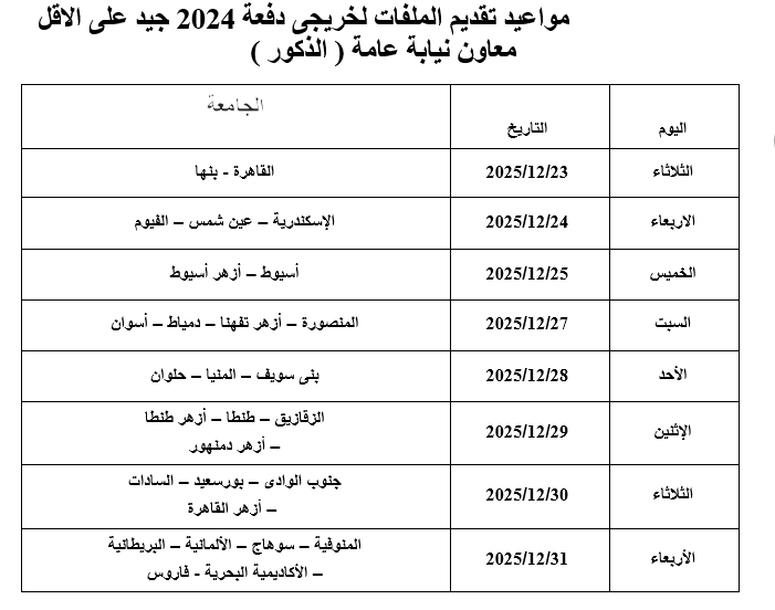 وذلك وفقاً للميعاد المحدد لكل جامعة بالجدول المرفق بالملف وبعد تسجيل المتقدم البيانات الكترونياً وفقاً للرقم السرى المرفق بالملف على موقع النيابة العامة www.ppo.gov.eg ولن يقبل الملف بدون أصل المؤهل .