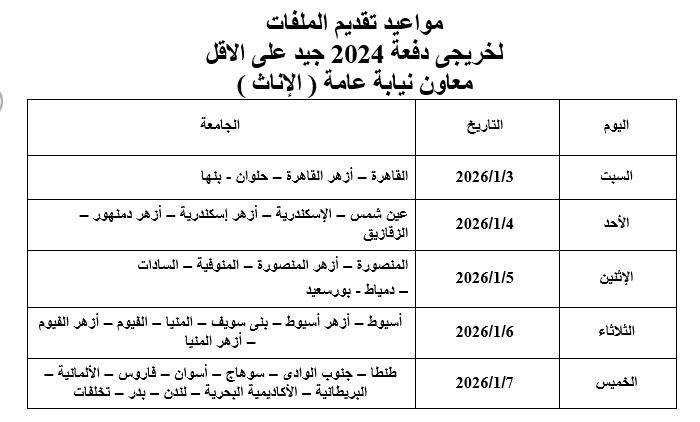 يطلب الملف اعتباراً من يوم السبت الموافق 20/ 12/ 2025 وحتى يوم الخميس الموافق 25/12/ 2025 وتقدم الملفات إلى مكتب تعيينات أعضاء النيابة بدار القضاء العالى اعتباراً من يوم السبت الموافق 3 / 1 / 2026 وحتى يوم الخميس الموافق 8/ 1/ 2026 من الساعة الثامنة صباحاً وحتى الساعة الرابعة مساءً يومياً.