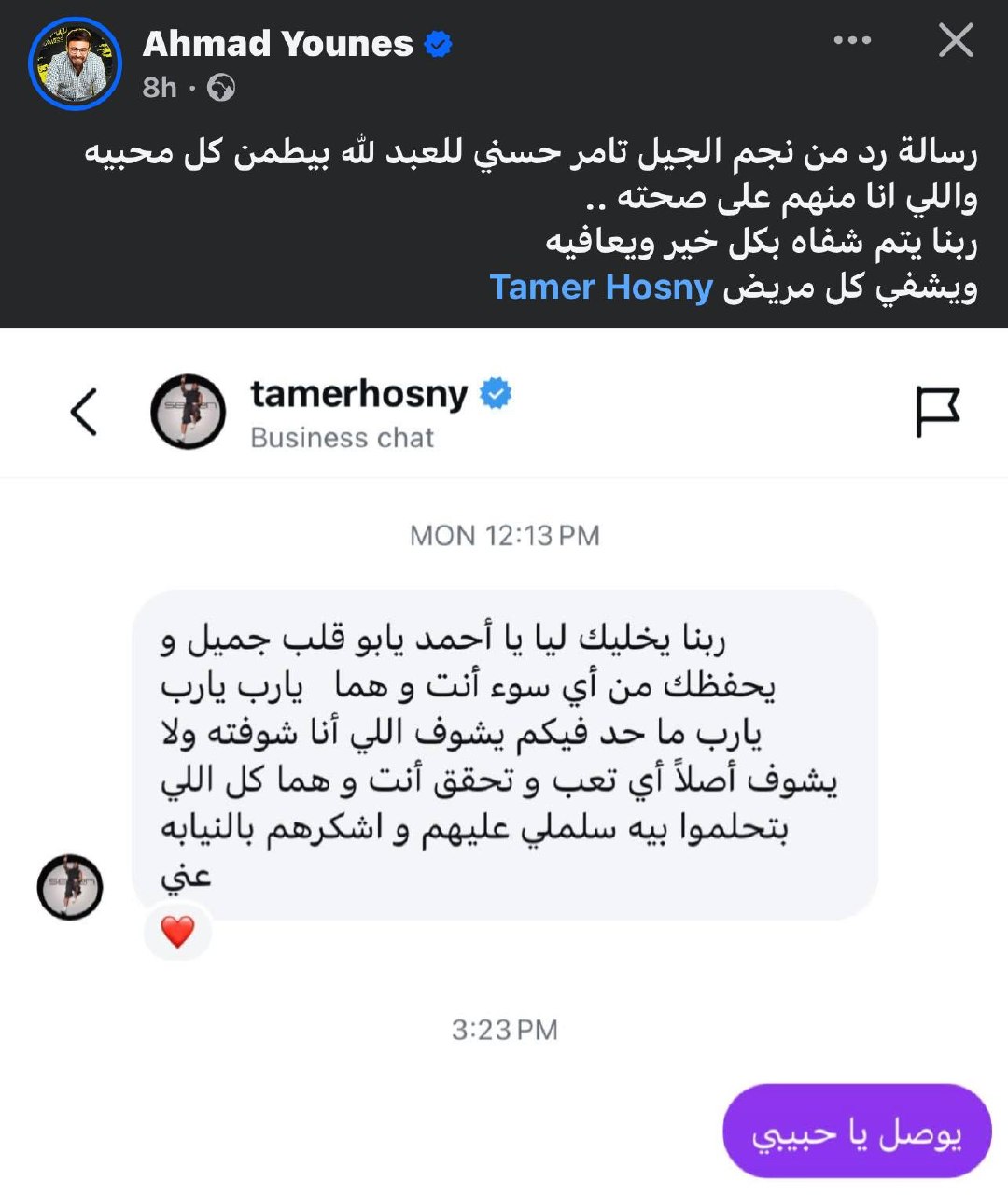 وعلق أحمد يونس:"رسالة رد من نجم الجيل تامر حسني للعبد الله بيطمن كل محبيه واللي انا منهم على صحته .. ربنا يتم شفاه بكل خير ويعافيه ويشفي كل مريض".